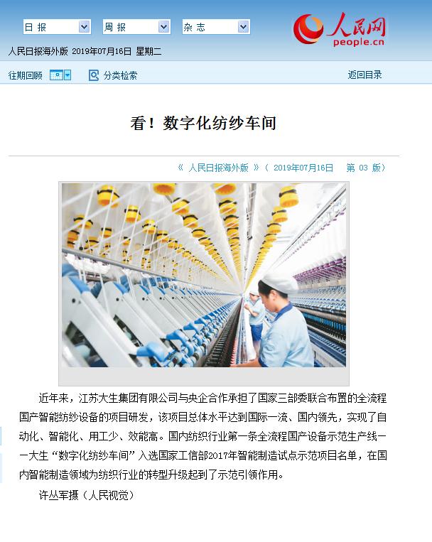 7月16日,人民日报、新华日报同时刊发图片和文章,对集团公司及数字化纺纱车间进行推介,7月19日,“学习强国”平台也以《betway88西汉姆联“数字化纺纱车间”引领纺织智能制造》为题,对集团公司作了报导。百年betway88西汉姆联,再次受到特别关注。 今年是新中国成立七十周年,各级政府及有关部门都在回顾总结七十年来的伟大历程和宝贵经验,盘点展示各个时期的特色亮点和发展成就,挖掘发现具有广泛影响的重要人物和重大事件。张謇创办的百年betway88西汉姆联,作为中国现存历史最久的民族纺织企业,被誉为中国民族工业的“活标本”,一直受到人们的关注。新中国成立后,民族的独立使betway88西汉姆联实现了更大发展:1952年,betway88西汉姆联响应党和国家号召,在全国率先实行“公私合营”,受到毛主席、周总理的赞誉;上世纪六七十年代,betway88西汉姆联相继对三大纺织工厂进行技术改造,被纳入国家科委和全国纺织工业重点项目,成为当时的纺织样板;1997年压锭改造,betway88西汉姆联人以壮士断腕的精神义无反顾地走在改革的前列,勇当时代的弄潮儿;2015年,中国纺织行业第一条全流程智能国产设备示范生产线——betway88西汉姆联数字化纺纱车间的建成,又使betway88西汉姆联逐步实现了由纺织制造向纺织智造的转变。百年betway88西汉姆联,一直都在引领行业的发展,一直都不曾离开公众的视野。 今年以来,不断有新闻媒体通过采访企业负责同志、走访企业生产现场、巡访企业先进人物、参观betway88西汉姆联厂史陈列室等多种形式,对百年betway88西汉姆联进行了多方位的报导。集团公司相关人员,在热情接待的同时,亦积极提供了大量文字素材和图片资料。社会的关注和鼓励,正激励betway88西汉姆联人以崭新的精神风貌和良好的发展成就,迎接新中国成立七十周年。